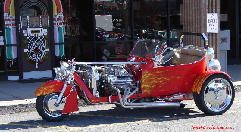 Custom T-bucket Trike V8 Chevy Custom Stroker Engine Harley Front End ~ Crazy Horse Real Fire Paint ~ 1st Place Show Winner. This Trike has been featured in magazines & advertising promotions This is the most elaborate Trike of its kind requiring 5 years and $75k in parts not including labor to build. It’s owned and designed by 70 yrs. old professional man with health issues. Trike is totally at home at any Bike or Car Show in the world with many prestigious show trophies to prove it. It was built to be very comfortable, safe, fun and is titled street legal. It's easy to operate and is not a kit. This is a complete package that includes an electric trike to ride the grounds at any show event plus 2 trailers. A custom built trailer to tow the electric trike plus 16' enclosed show trailer that everything fits into for road trips. The 16' show trailer has many accessories including an alarm security system. The winning bidder will practically get both trailers and the electric trike for free if the reasonable reserve is meet. Over the past 3 years I made several improved revisions which included hiring the world famous Crazy Horse Painting at Click Here who did the "Real Fire" paint job. I also added the custom chrome aluminum spinner wheels, night lighting system, under seat stereo system, dual yellow top battery system and custom chrome roll bar. Other accessories added includes a GPS unit mounting in cab. ~ Bill Hutton ~ Questions 704 771-0377 ~ Email: bill@rarestuff4u.com